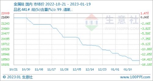 1月19日,生意社金属硅基准价为18500.00元/吨,与1月1日(19040.00元/吨)相比,下降了-2.84%。