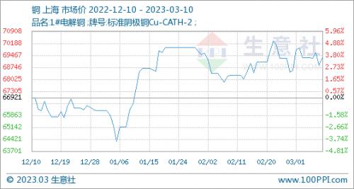 3月10日,生意社铜基准价为69360.00元/吨,与本月初(68580.00元/吨)相比,上涨了1.14%。