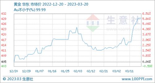 3月20日,生意社黄金基准价为429.67元/克,与本月初(413.48元/克)相比,上涨了3.92%。