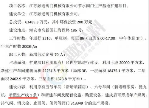 值得一提的是,江苏融通阀门机械所在的江苏省,曾发布《江苏省重点行业挥发性有机物污染控制指南》指出:鼓励使用水性、高固份、粉末、紫外光固化涂料等低VOCs含量的环保型涂料,限制使用溶剂型涂料。其中汽车制造、家具制造、电子和电器产品制造企业环保型涂料使用比例达到50%以上。