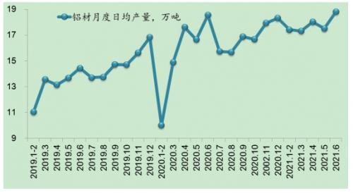 二是消费进入传统淡季,但总体表现好于预期。国家统计局基于中国采购经理指数等宏观指标判断,今年7月份我国经济继续保持扩张态势,但步伐有所放缓。特别是局部地区高温洪涝灾害等极端天气影响,制造业扩张力度较上月有所减弱,但大多数行业仍处于景气区间。今年上半年,全国基础设施投资同比增长7.8%,两年平均增长2.4%,比前5个月下降0.2个百分点;全国电网工程完成投资1734亿元,同比增长4.7%。6月份汽车产销继续回落,环比分别下降4.8%和5.3%,同比分别下降16.5%和12.4%。但新能源汽车产销持续保持高速增长,6月份市场渗透率继续提升,达到12.8%。鉴于芯片供给不足影响犹存,预计7月份汽车产销仍维持上月表现,产品结构性调整继续。此外,光伏装机的加速建设也持续为铝消费增长增添新动能。