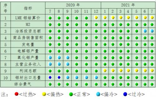 由中国铝冶炼产业景气信号灯(见表2)可见,2021年7月份,在构成产业景气指数的10个指标中,M2、商品房销售面积、氧化铝产量、电解铝产量、发电量、主营业务收入和铝材出口总量等7项指标均处于“正常”区间;LME铝结算价和利润总额等2项指标处于“偏热”区间;铝冶炼投资总额处于“偏冷”区间。
