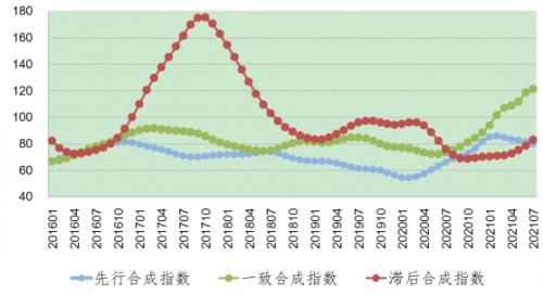 2021年7月份,先行合成指数为79.7,较上期回落2个点。中国铝冶炼产业合成指数曲线见图2。构成先行合成指数的5个指标中,经季节调整后,较上月回落的指标包括铝冶炼投资总额、商品房销售面积分别下降2.8%、0.9%;同比回落的指标是铝冶炼投资总额,下降20.2%。
