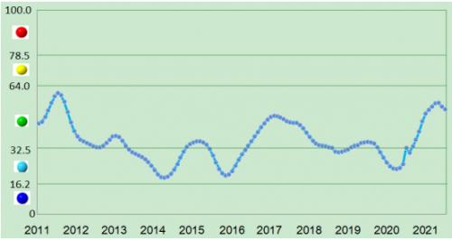 2021年7月份,中国铝冶炼产业景气指数回落1.2点至51.5,是继5月份达到年内高点以来出现回落的第2个月份,降幅较6月份有所收窄,仍处于“正常”区间中上部。中国铝冶炼产业月度景气指数走势见图1。
