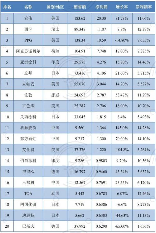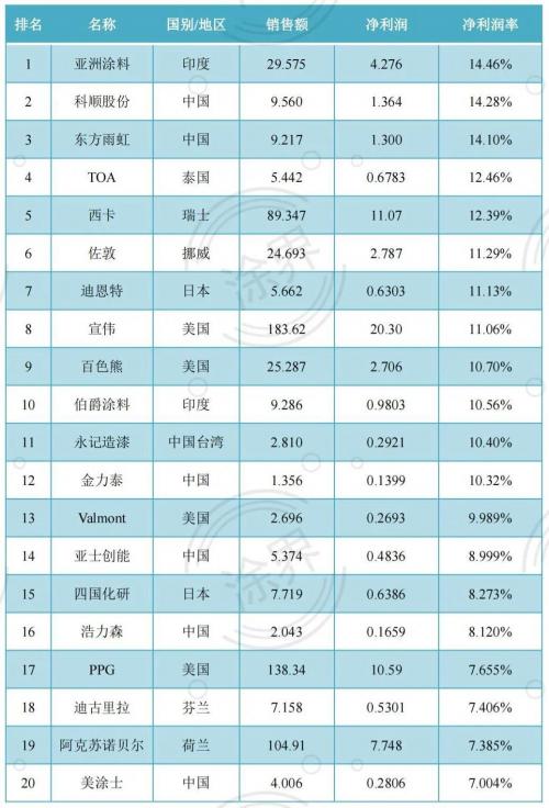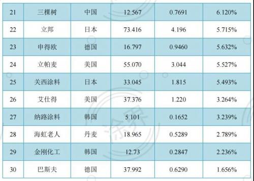 2021全球最赚钱30家涂料公司净利润率排行榜