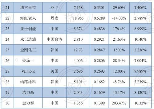 2021全球最赚钱的30家涂料公司(单位/亿美元)