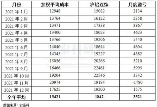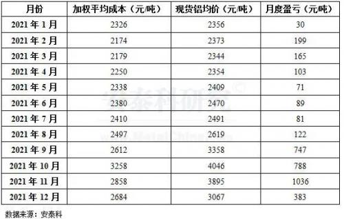 但是目前也不是全行业都盈利,一些高成本企业仍然处于亏损状态。安泰科测算,2021年12月中国电解铝行业加权平均成本为17625元/吨,与当月铝价19200元/吨相比,理论盈利1575元/吨。12月全国315万吨产量中亏损比例达41%。
