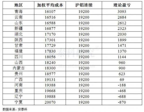 表6 2021年12月中国电解铝行业分地区加权平均成本与盈亏对比