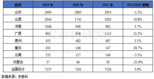 据安泰科统计,截至2021年12月底,中国氧化铝产能达到9035万吨/年,产能比2020年同期增加了170万吨/年。新增产能集中在广西、贵州地区,其中广西龙州新翔生态铝业有限公司、贵州广铝一期二段为新建投产产能,产能共计130万吨/年;广西靖西天桂铝业、国电投务正道氧化铝公司通过产能扩容,提升产能共计40万吨/年。产量方面,2021年我国氧化铝产量预计为7520万吨,同比增加5.9%。