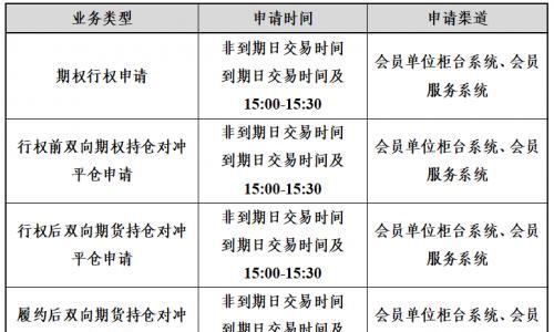 在每个交易日的交易时间以及到期日的15:00-15:30,客户可以提交“行权”“双向期权持仓对冲平仓”“行权后双向期货持仓对冲平仓”和“履约后双向期货持仓对冲平仓”申请。