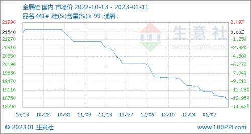 1月11日,生意社金属硅基准价为18690.00元/吨,与1月1日(19040.00元/吨)相比,下降了-1.84%。