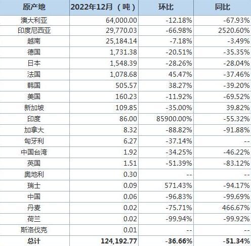 以下为根据中国海关总署官网数据整理的2022年12月氧化铝进口分项数据一览表: