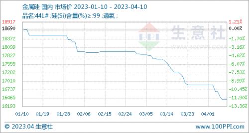4月10日,生意社金属硅基准价为16420.00元/吨,与本月初(16890.00元/吨)相比,下降了-2.78%。