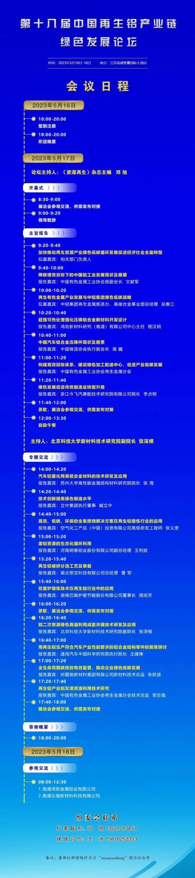 第十八届中国再生铝产业链绿色发展论坛将于2023年5月16—18日在江苏南通举办。本届论坛以“践行绿色发展新目标、担当低碳发展新使命、实干美丽中国新征程”为主线,设置主旨报告、专题论坛、行动宣言、展洽会、供需对接等重要环节和专场,从政策宣贯、原料保障、技术推广、装备应用、上下游协同、税收、标准等要素入手,力邀20余位嘉宾和大咖,以实际运用为重点,结合产业热点,解决低碳发展痛点与难点,欢迎报名参加。