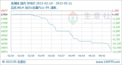 5月11日,生意社金属硅基准价为15790.00元/吨,与本月初(16140.00元/吨)相比,下降了-2.17%。