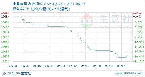 6月26日,生意社金属硅基准价为13730.00元/吨,与本月初(14170.00元/吨)相比,下降了-3.11%。