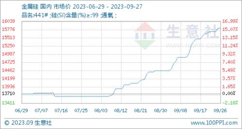9月27日,生意社金属硅基准价为15820.00元/吨,与本月初(14460.00元/吨)相比,上涨了9.41%。