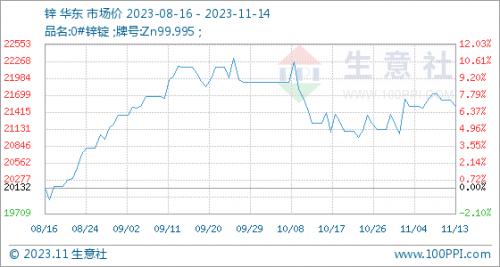 11月14日,生意社锌基准价为21506.00元/吨,与本月初(21216.00元/吨)相比,上涨了1.37%。