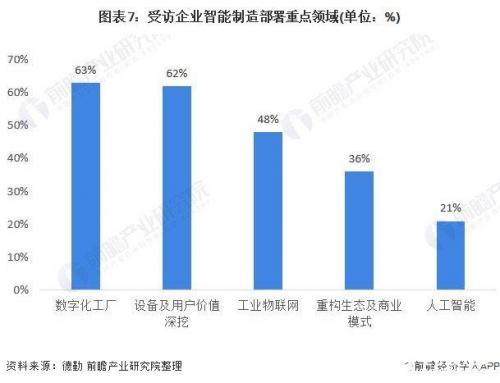 根据德勤调查发现,中国工业企业智能制造五大部署重点依次为:数字化工厂(63%)、设备及用户价值深挖(62%)、工业物联网(48%)、重构生态及商业模式(36%)以及人工智能(21%)。