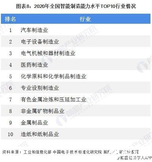 2020年全国智能制造能力水平TOP10行业中,汽车制造业的智能制造能力水平位居前列;其次为电子设备制造业、电气机械和器材制造业等。