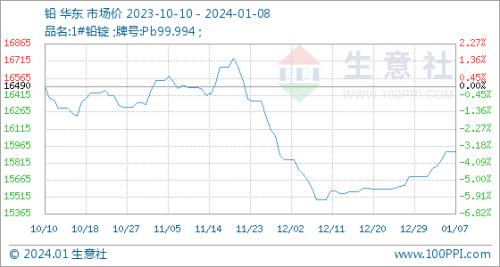 1月8日,生意社铅基准价为15915.00元/吨,与本月初(15695.00元/吨)相比,上涨了1.40%。