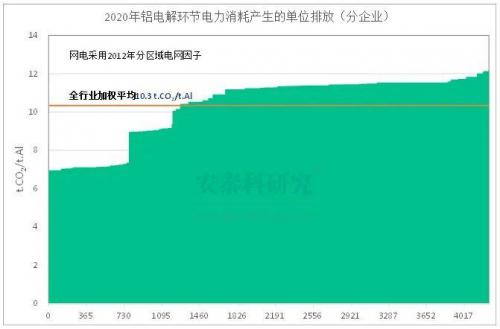 依据国家标准《温室气体排放核算与报告要求第4部分:铝冶炼企业(GB_T32151.4-2015)》,以电解铝厂为单元,通过对供电方式(自备电、网电),网电企业所在区域等细节数据进行详细分析,得出了2020年全国电解铝厂铝电解环节电力消耗产生的排放数据。其中,自备电厂的排放因子采用0.85kg.CO2/kWh,各地区电网的排放因子采用国家气候中心发布的2012年数据(暂无最新数据)。研究结果显示,2020年中国建成产能4250万吨/年,铝电解环节电力消耗产生的排放的加权平均值为10.3t.CO2/t.Al,最低值为7.0 t.CO2/t.Al,最高值为12.1t.CO2/t.Al,全国有41家电解铝厂合计1270万吨/年产能的排放低于全国平均值,占30%。分地区来看,水电丰富地区排放较低,其中云南省排放最低,为7.1 t.CO2/t.Al,四川、贵州、湖北、广西、青海、福建、甘肃等省区的排放也都低于全国平均水平。