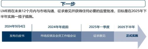 为了支持大手交易限额规则的实施,LME还将推出流动性提供者计划,以鼓励近月合约在电子盘上的流动性。此外,为进一步提高透明度,LME将确保办公室间市场商定的所有交易(月合约)——无论其规模如何——都被登记到LME系统中,并包含在市场数据源中。