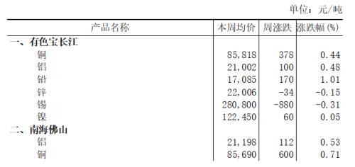 本周(2025年10月20日-10月24日)有色宝长江基本金属4个品种上涨,2个品种下跌。其中,铜均价环比上涨0.44%,铝上涨0.48%,铅上涨1.01%,锌下跌0.15%,锡下跌0.31%,镍上涨0.05%。本周(2025年10月20日-...