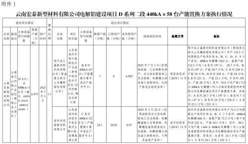 为贯彻落实《国务院关于化解产能严重过剩矛盾的指导意见》(国发〔2013〕41号)、《国务院办公厅关于营造良好市场环境促进有色金属工业调结构促转型增效益的指导意见》(国办发〔2016〕42号)精神,按照《工业和信息化部关于电解铝企业通过兼并重组等方式实施产能置换有关事项的通知》(工信部原〔2018〕12号)要求,2019年12月26日,云南省工业和信息化厅门户网站发布了《云南宏泰新型材料有限公司电解铝建设项目产能置换方案》(云南省工业和信息化厅公告2019年第18号)。该项目共建设A、B、C、D、E、F六系列、产能202.78万吨,分期建设分段投产,为确保产能置换方案执行到位,2025年7月云南省工业和信息化厅组织文山州工业和信息化局、砚山县工信商务局、行业专家对云南宏泰新型材料有限公司电解铝建设项目D系列二段440kA×58台产能置换方案执行情况进行现场核实验收,现将有关情况予以公告(详见附件),欢迎社会公众进行监督。联系电话:0871-63513030。
