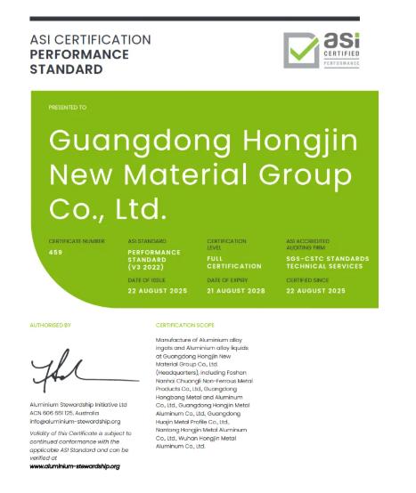 广东鸿劲新材料集团有限公司(总部)及其位于中国的六家子公司——包括广东鸿劲新材料集团股份有限公司、广东鸿劲金属铝业有限公司、南通鸿劲金属铝业有限公司、广东华劲金属型材有限公司、武汉鸿劲金属铝业有限公司、佛山南海创利有色金属制品有限公司、广东鸿邦金属铝业有限公司——已成功通过铝业管理倡议ASI绩效标准V3(2022)认证,认证范围涵盖铝合金锭及铝液的生产制造。