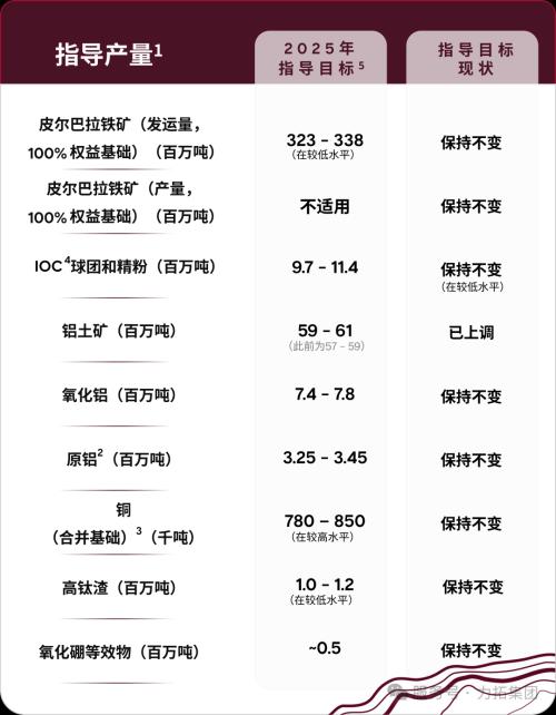 铝土矿2025年产量指导目标上调。所有其他产品的产量指导目标保持不变。