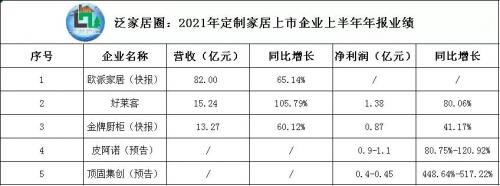 时至8月底,各大上市家居企业的2021半年度业绩报告陆续披露,由于2020年的艰难发展,2021年仿似迎来了新一轮的希望,业绩和增速等方面多呈现出异常可喜的景象。目前,就九大全屋定制家居上市企业而言,欧派家居、好莱客、金牌厨柜、皮阿诺、顶固集创均披露了2021半年报相关。