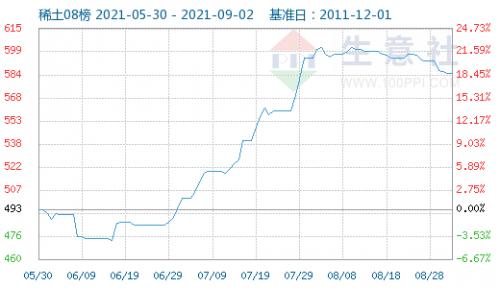 9月3日稀土指数为584点,较昨日下降了1点,较周期内最高点1000点(2011-12-06)下降了41.60%,较2015年09月13日最低点271点上涨了115.50%。(注:周期指2011-12-01至今)。