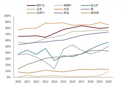 考虑到对外依存度,有必要建立大宗商品战略储备。目前我国仍是大宗商品的主要消费国,短期内进口仍是供应的重要补充。需求和供应的季节性不同步,有可能导致缺口的季节性存在,这对大宗商品进口来讲,是较大的挑战。目前国内企业已经建立商业储备,但从规模上仍不能保证旺季供应。横向比较大宗商品的商业库存水平,以国外进口为主的上游品种,有的库存天数较高,如铁矿、铝土矿、铜精矿等金属矿产,库存天数保持在25天以上,但是,以进口大豆为例,大豆压榨企业依赖进口大豆到港,按照现阶段的压榨产能,库存仅支持20天左右的生产。我们从三个维度衡量大宗商品产业链的进口风险,一是对外依存度,即净进口量占总消费量的比重,二是来源集中度,即排名前四的进口来源国占总进口量的比重,三是进口金额。从下图可知,原油、铁矿石和大豆的对外依存度与来源集中度都比较高,且进口金额较大,属于进口风险较高的大宗商品。铝土矿和镍等具有新能源属性的金属对外依存度近年来增长较快,能源转型将提振相应需求,因此未来可能有一定风险。