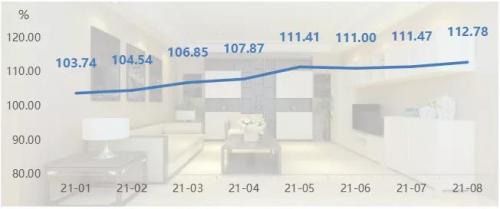 8月,大沥全铝家居价格继续走高,指数收报112.78点,环比上涨1.17%,同比上涨10.66%。全铝家居价格指数走势见下图: