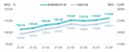 8月,家居铝型材价格指数达到今年以来最高点112.40点,环比上涨1.56%,较上月0.52%的涨幅明显扩大。铝锭价格收报20619元/吨,环比上涨5.70%。家居铝型材价格指数与铝锭价格均已超过今年5月峰值,创下新高。家居铝型材价格指数和铝锭价格走势见下图: