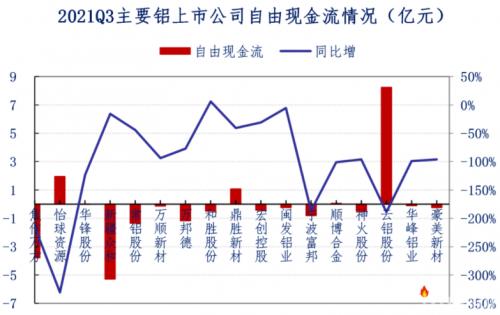 今年以来,铝价过高导致铝加工企业资金流承压。与去年同期相比,今年三季度铝行业上市公司自由现金流大幅减少。调研得知,今年上半年铝价高企给不少铝加工企业造成了亏损,现在铝加工企业大多选择降低库存、不设安全库存等方式进行生产。调研的铝加工企业普遍对铝价持续上涨持悲观态度,也有部分铝企看好价格维稳。