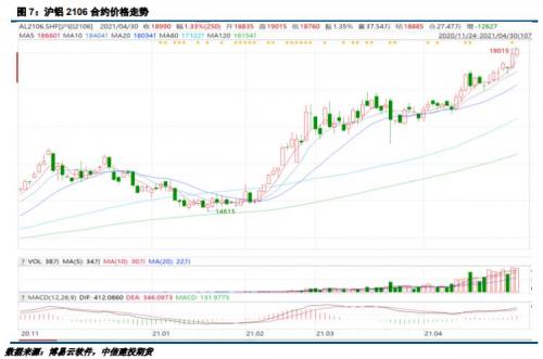 上月沪铝持续走高,价格重心再次上移。月初受电解铝库存影响,价格在17500元/吨附近低位震荡。月中在宏观情绪影响下,市场通胀预期不断抬升,价格突破万八压力位。临近月末,随着伦铝价格持续上行,沪铝价格跟随走高,价格一度突破万九压力位。截至四月底,报收18990元/吨,月涨幅10.79%。