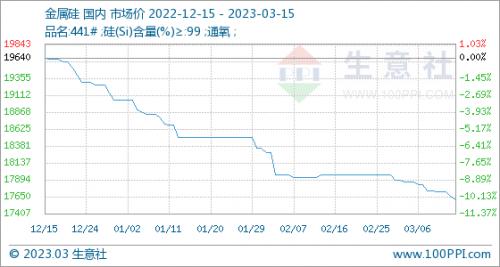 3月15日,生意社金属硅基准价为17610.00元/吨,与本月初(17960.00元/吨)相比,下降了-1.95%。