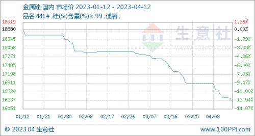 4月12日,生意社金属硅基准价为16290.00元/吨,与本月初(16890.00元/吨)相比,下降了-3.55%。