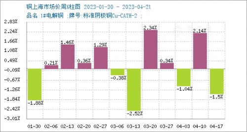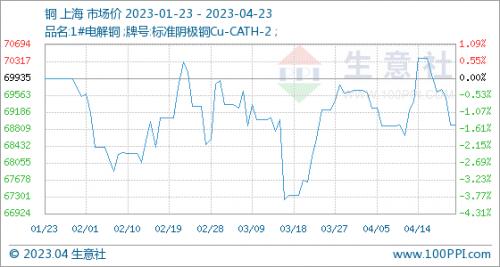 4月23日,生意社铜基准价为68900.00元/吨,与本月初(69680.00元/吨)相比,下降了-1.12%。