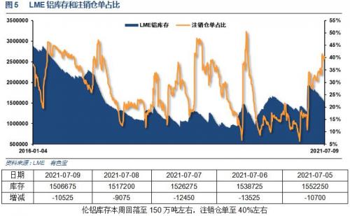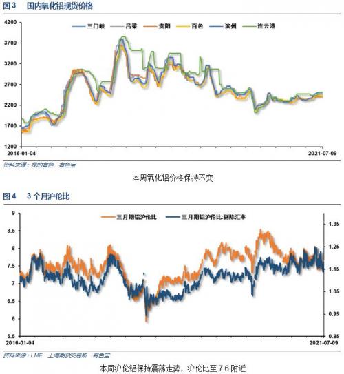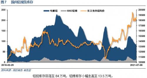 2021年6月中国氧化铝产量为622.8万吨,同比增加11.85%。2021年6月中国原铝产量为317.67万吨,平均日产10.59万吨,年化产量3864.99万吨。2021年6月中国电解铝行业综合使用电价加权平均值为0.3143元/千瓦时,较2021年5月0.3132元/千瓦时上涨0.0011元/千瓦时,环比上涨0.35%,同比上涨4.1%。2021年6月中国电解铝行业含税成本加权平均值为13809.50元/吨,较2021年5月13585.4元/吨上涨224.1元/吨,环比上涨1.65%,同比上涨11.3%。2021年6月原料端继续上涨,氧化铝价格平均上涨58元/吨,阳极碳素本月上涨230元/吨,导致电解铝行业成本有所上涨。