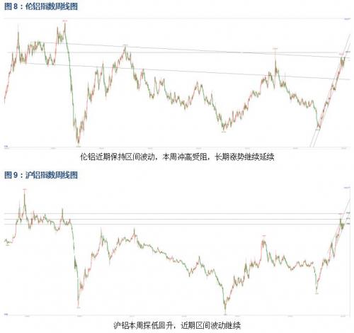 伦铝近期保持区间波动,本周冲高受阻,长期涨势继续延续。沪铝本周探低回升,近期区间波动继续。