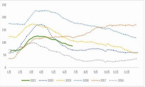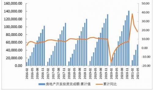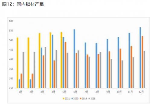 从房地产市场来看,1-5月份,全国房地产开发投资54318亿元,同比增长18.3%;比2019年1-5月份增长17.9%,两年平均增长8.6%。其中,住宅投资40750亿元,增长20.7%。1-5月份,房屋竣工面积27583万平方米,增长16.4%。其中,住宅竣工面积19880万平方米,增长18.5%。1-5月份,商品房销售面积66383万平方米,同比增长36.3%;比2019年1-5月份增长19.6%,两年平均增长9.3%。其中,住宅销售面积增长39.0%,办公楼销售面积增长10.5%,商业营业用房销售面积增长8.2%。5月份,房地产开发景气指数为101.17。受2020年下半年土地购置面积下降以及“两集中”土拍新政影响,在短期可开工储备下降的情况下,二季度房企新开工增速由正转负,但绝对规模已恢复至去年三季度以来的水平。随着核心城市首批宅地的陆续开工,新开工面积有望继续修复,但整体增速将不可避免的受到政策拖累而放缓。不过地产销售景气度的整体高位仍将为后续铝材消费提供支撑。