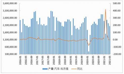 从汽车行业来看,4/5月汽车产量223.4/204万辆,同比增长6.25%/-6.78%。4/5月汽车销售量225.1/212.7万辆,同比增长8.63%/-3.06%。二季度汽车产销年内首次出现同比负增长,主要是受去年同期高基数影响,在去年疫情修复的大背景下,今年同比增长压力明显。但与2019年同期相比,今年的发展态势依然良好。产销环比数据二季度也出现了下降,主要是受芯片供应问题影响,在缺芯问题逐月加剧的情况下,叠加原材料价格的大幅上涨,在产企业的成本压力明显增大。不过从上游半导体行业的情况来看,二季度或为芯片供给最紧张的阶段,下半年缺芯问题或将逐渐得到改善,叠加低库存环境下的补库需求,我们认为后续乘用车市场将迎来修复周期,铝材的需求也将得到保障。