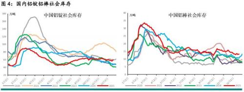 国内铝棒、铝杆等半成品产能持续扩张,依托电解铝厂配套加工厂增多,对铝水消化能力进一步上升,这使得电解铝厂铸锭量进一步下降,在电解铝产量增加的情况下,铝锭产量实际无显著增加。2025年多数时间铝水比例均在75%上下。不过由于年内进口量继续增加并再创新高,铝锭库存也未降至极低,且年末较年初仍有一定累库。据钢联数据,年初国内铝锭社会库存在春节前备库带动下延续2024年年末去库状态,自47万吨水平降至44万吨以下。春节前后,铝棒企业开工率下降,电解铝厂铸锭量增加,市场进入季节性累库状态,社会库存逐步攀升至最高90万吨,这与2024年高位基本相当。二季度消费回暖,铝棒企业开工率回升,铝水比例随之回升,铸锭量减少,进入逐步去库阶段,显性库存降至45万吨水平,远低于2024年同期的75万吨水平。三季度库存再度季节性回升,但也仅回升至64万吨水平。“金九银十”消费积极性回暖,市场再度进入去库状态,但去库力度明显有限,价格不断创新高对消费有一定压制作用,社会库存仅下降至60万吨水平。四季度库存继续小幅去化,但去化力度明显不足,社会库存在下降至56万吨后转升至近60万吨水平。年内铝棒库存多数时间处于往年同期高位,春节前后最高攀升至近33万吨以上,虽然之后逐步回落,年底降至13万吨水平,但仍高于往年同期。