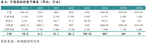 虽然有超高利润加持,国内电解铝可释放产能非常有限,仅有部分存量产能尚未投放,部分在2025年年底通电,2026年一季度逐步投产。考虑到产能投产几无阻力,待投产能按计划投产的可能性较大。除此之外,部分新建产能则为置换产能,新产能投放的同时被置换的产能将同步关停,这或因新产能产量释放滞后,对产量有一定影响,但考虑到冶炼厂不会放弃高利润,会尽可能降低运行产能切换带来的影响。预计国内运行产能将延续攀升态势,并逐步逼近4500万吨产能天花板。预计2026年国内产量将达到4471万吨,较2025年增1.42%。