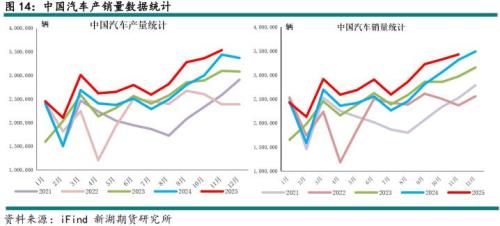 国内电解铝消费结构继续调整,交通运输业已跃升第一大消费板块,占比达到20%。虽然目前汽车市场也面临一定问题,行业内卷式竞争势头严重,购置税相关优惠政策退坡,但产业仍维持高速增长。2025年汽车产销量增速超预期,新能源汽车市场增速不减,传统燃油车也表现亮眼。预计2026年新能源汽车增速或略有放缓,但仍维持较高增长势头。预计2026年汽车市场贡献超百万吨电解铝消费。