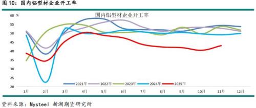 具体看,年内铝型材企业综合开工率基本下降至45%上下,年初甚至下降至40%以下,不过与2024年相比,春节月开动率并未大幅下降,降幅相对平滑,开动率下降至35%以下,不过这仍是除2024年2月以外往年同期最低。4月份开工率短暂回升至50%,但之后逐步下降,10月份下降至40%。年底冲量带动下,11月开工率略有回升,但仍远低于往年同期。