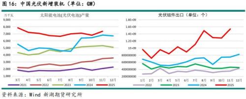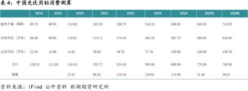 2026年国内光伏产业在经历明显调整后有望逐步改善,产业利润得到修复,并回到稳步发展的通道。国内市场增量或有限,但海外市场增长空间依旧大,带动组件出口继续高速增长。预计2026年国内光伏新增装机有望达到310GW,较2025年增6.89%。光伏组件产量则有望达到680GW,较2025年增7.1%,贡献约618万吨铝消费,较2025年增4.77%。而光伏支架方面的消费稳中有增。光伏产业用铝量有望接近760万吨,占总消费量比重也进一步上升至16%左右。